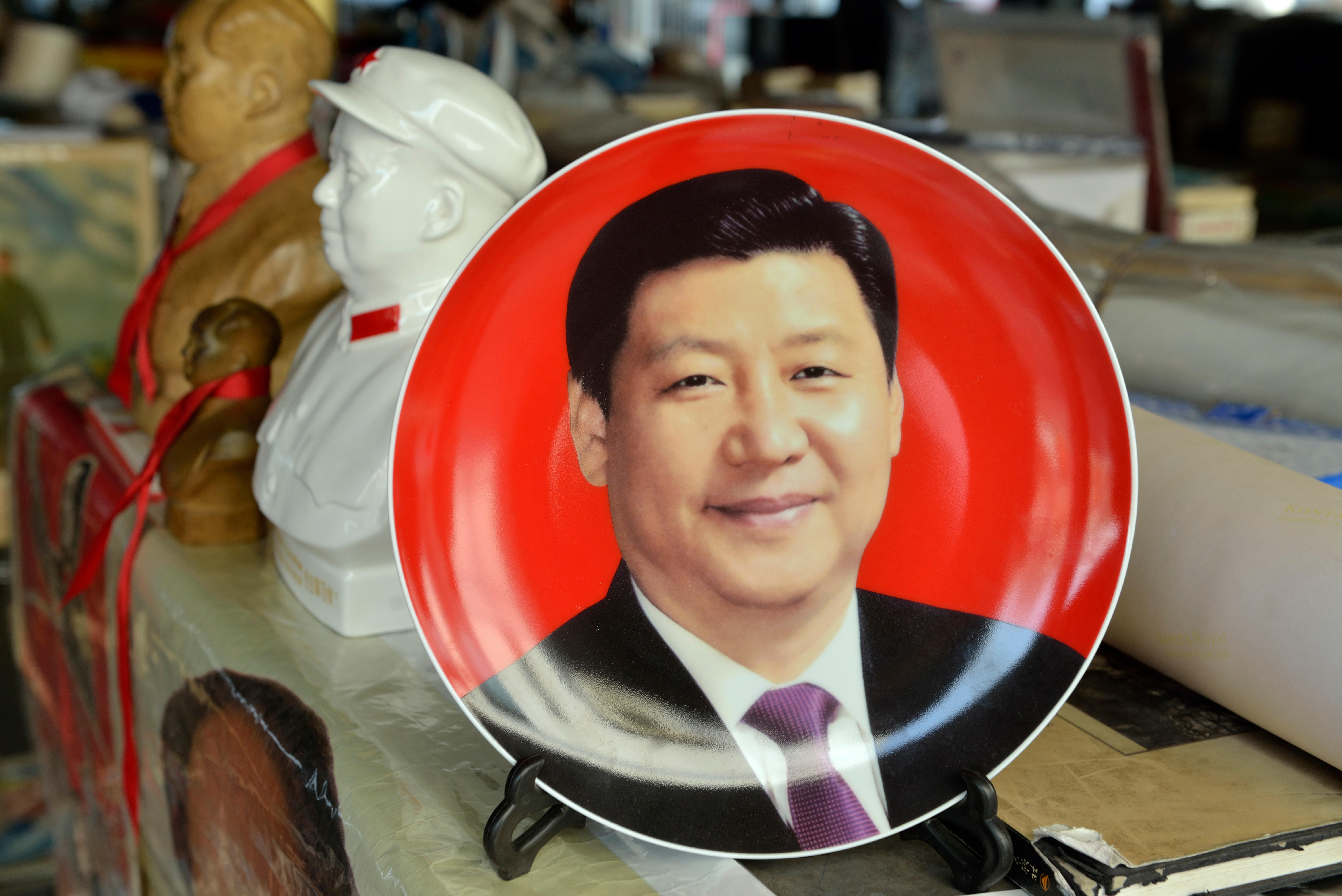 Memorabilia of Chinese president Xi Jinping on sale with that of Mao Zedong in Panjiayuan flea market in Beijing, 2014 (Lou Linwei/Alamy)