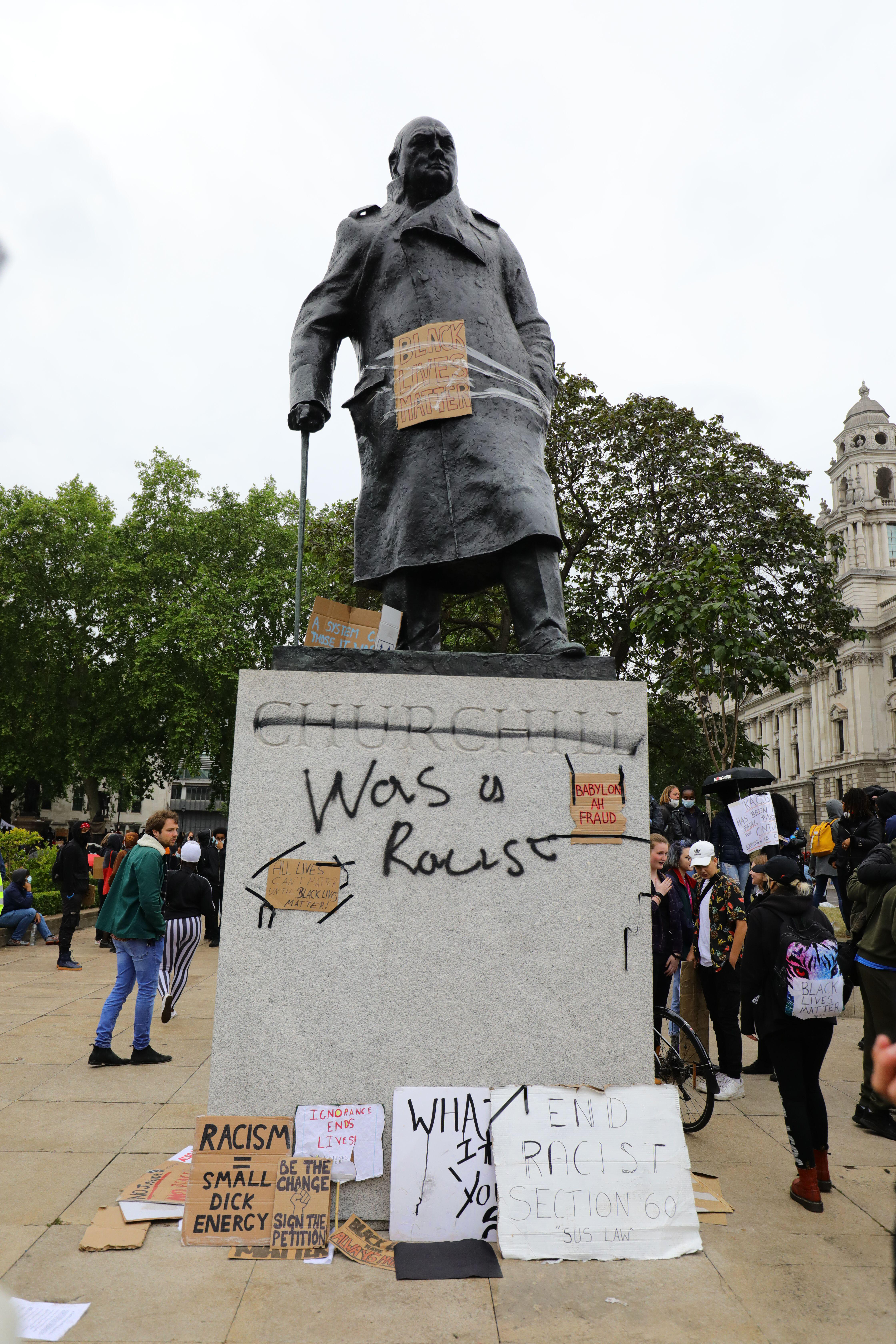 Grafitti on the Winston Churchill statue, photograph by Aaron Chown (PA Images / Alamy)