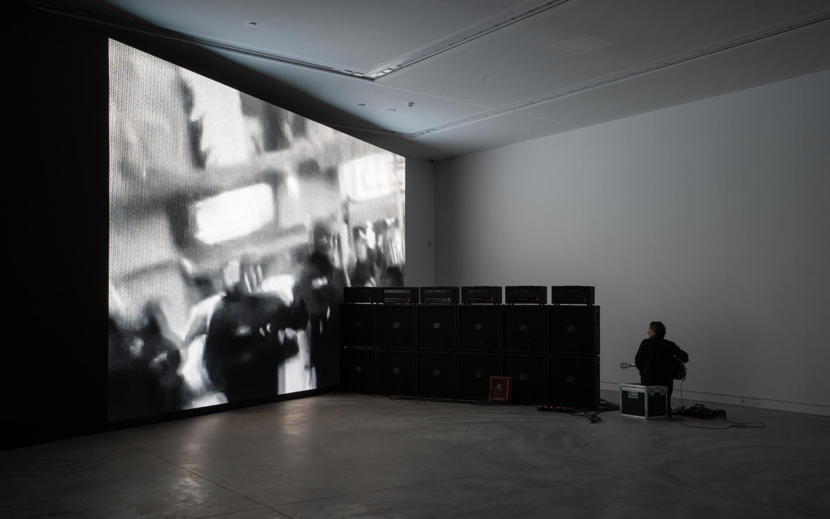 While the concentration of pavilions can make it challenging for individual shows to stand out, the Australian Pavilion does an exceptional job of announcing its presence – indeed, you can hear it before you see it. This work – a piece by Marco Fusinato entitled DESASTRES – is performed live throughout the duration of the Biennale, with Fusinato using an electric guitar to improvise slabs of noise that synchronise with a deluge of images appearing on a floor-to-ceiling screen. A combination of ‘death’ and ‘disaster’, the title is drawn from the two initial terms used in an internet search that generates images for the piece. This title is, of course, also layered with art historical and cultural references, evoking Andy Warhol’s silkscreen series depicting accidents and catastrophes along with Francisco Goya’s etchings Disasters of War, here reformatted for the doomscrolling era. Guitar on his lap, Fusinato faces the screen with his back turned to the audience, echoing a familiar compositional strategy where a back-turned figure serves to transport the viewer into the space of the image. This amplifies the hypnotic effect of the loud reverberating sound and strobe-like flickering of images depicting riots, natural calamities, and virus-transmitting rodents. The result is mesmerising, with visitors left wondering how to break free from the artist’s spell.