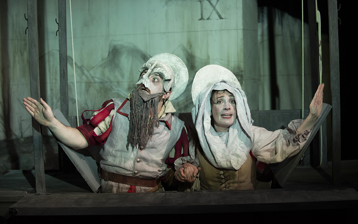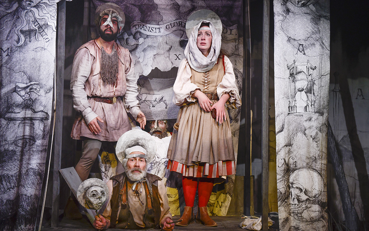Once the audience settles into the theatre proper, we meet the actors behind those masks: medieval players in a travelling show on their way to make a deeper impression on a Duke than they did the previous year. Larking (Dion Mills) is the bossy, perennially disappointed director, who also fittingly plays the figure of God. He is carrying on a vaguely covert tryst with Rona (Olga Makeeva), who isn’t sure whether he’s the father of her unborn baby. It could be Gregory (Brian Lipson), the ‘effects man’ who builds the props and theatrical devices that distinguish the company from other travelling shows. Brom (Darcy Kent) is the solid hero type with the booming voice cast as Noah in the new ‘flood play’ the company is working on. Hollis (Emily Goddard) is the grieving sister from the prelude, anxious about the future and straining against her role as Noah’s wife, a hopelessly underwritten part she wants to bolster with some script changes.