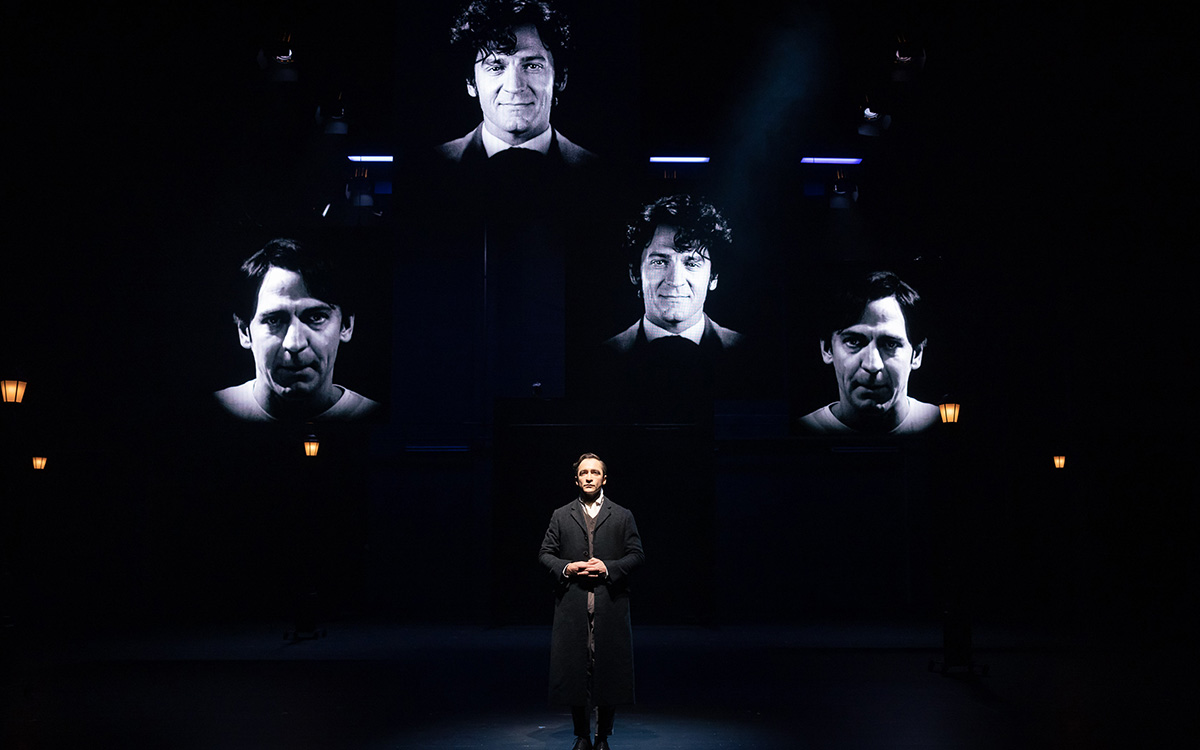 Meanwhile, David Bergman’s video design, paired with Susie Henderson’s video editing, revels in the cinematic traditions that have cemented the text’s cultural shorthand. After all, it was a 1908 film adaptation of the novella, since lost, that was considered the first American horror film. Filmed largely in black and white, the show’s video components recall the melodrama of early horror cinema. The camera zooms in on blood-curdling screams and violence is implied with fast cuts and jarring angles. A tilted shot of a shadowy staircase is taken right out of Alfred Hitchock’s Vertigo, and Clemence Williams’s string-heavy compositions recall a Hitchockian version of the ornate scores of 1960s Hammer horror. Hyde is a combination of matted curls, jet-black eyes and a stylised voice that would be right at home beside Vincent Price. Some may find this stylised transformation ironically too minimalistic in the wake of CGI-heavy adaptations and the more overt monstrousness advanced by adaptations like Wildhorn and Bricusse’s 1990s musical. Others may consider the show’s slow pacing a jarring contrast to Williams’s more bombastic Dorian Gray. But, as in Stevenson’s novella, there is cumulative benefit to Williams’s minimalism that rewards our patience.