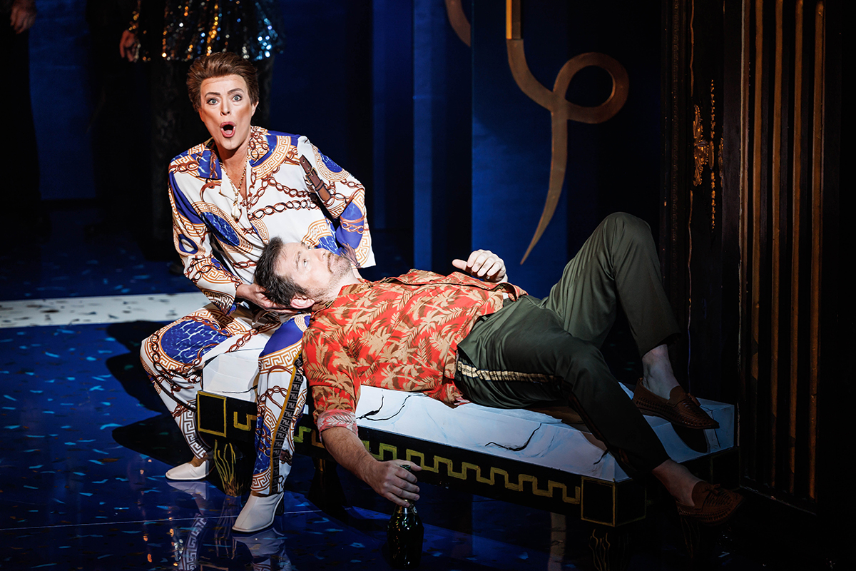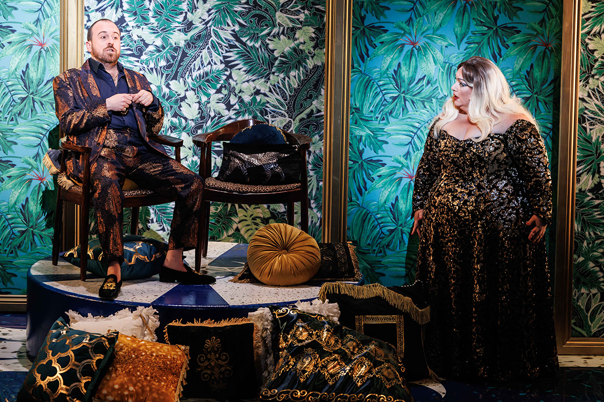 Duly softened up, and keen (especially at a matinee) not to seem academic or, worse, snobbish, we find ourselves enjoying the romp that follows. We arrive in ‘a world of power, corruption, debauchery and excess’ very like any wealthy suburb near you. Abrahams writes: ‘A euro-trash fashionista aesthetic offered a contemporary reference point for the brand of “Borgia”, and felt like a wonderful playground in which to place Lucrezia.’ The sets are bright, florid, comic. Harriet Oxley’s excellent costumes are straight out of a Versace catalogue, and mafia tropes help us to make sense of ‘the gangs and political machinations of the story’. Lucrezia, blonde as the historical character, is draped in gold and covered in bling.