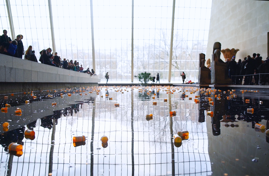 Goldin learned how to stage a die-in from ACT UP – the AIDS Coalition to Unleash Power. In the 1980s, ACT UP developed a template for how to most effectively stage direct action: protests should have clear demands, be specifically targeted to make the right people accountable, and aim at achieving quick change. Driven by the slogan, SILENCE = DEATH, ACT UP developed a striking visual language and learned how to attract maximum media coverage. Adopting these principles, Goldin and P.A.I.N. set out to grab the limelight and combat the silence around the epidemic of death stemming from the opioid addiction crisis caused largely by OxyContin. They planned each action to work with the specific physical space of each institution, targeted times when the spaces would be full, and learned ‘to speak through the media, not to the media’.