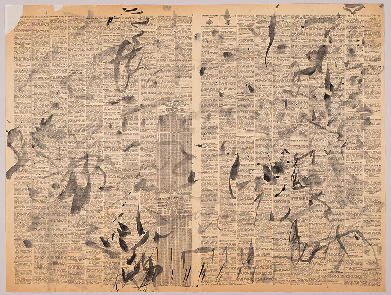 These minimalist drawings contrast with the bulk of the other works, many of which are executed in gouache on newspaper, an archivally unstable material that can also seem abject and ephemeral. Tuckson produced hundreds of newspaper pieces, suggesting that they sustained and engaged him beyond mere rehearsal. In some examples blots of fluid black paint almost obliterate the newsprint; in another (Untitled, undated [TD 2472]) which Margaret Tuckson put aside for herself in a roll of drawings, restless feathery gestures, dabs, and dashes are dispersed across the surface, transparent here and delicate points of calligraphic blackness there. These pieces indicate how important calligraphy was to Tuckson, as a series of more explicit homages to Chinese characters and ideograms in SYNERGY shows.