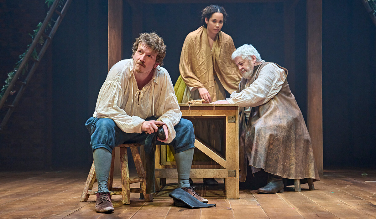 The dialogue, much like the costumes and the music (played live on traditional instruments but with nods to more modern-genres such as trip-hop), evoke period details without being overly dependent on the historical record. Detailed descriptions of historical buildings in Stratford have been dispensed with, although Tom Piper’s wooden stage design effectively mirrors the architecture of a Tudor-period cottage. Chakrabarti, born and raised in the resolutely non-picturesque city of Birmingham (just under sixty kilometres from Stratford) has some fun with local knowledge: when Mary, Will’s mother, expresses concern about such a sheltered young man moving to the capital, he protests that he has been to Kenilworth, a small village near Stratford. Whilst Shakespeare’s experiences in London are referred to elliptically through letters in the novel, they are physically re-enacted for the Stratford stage.