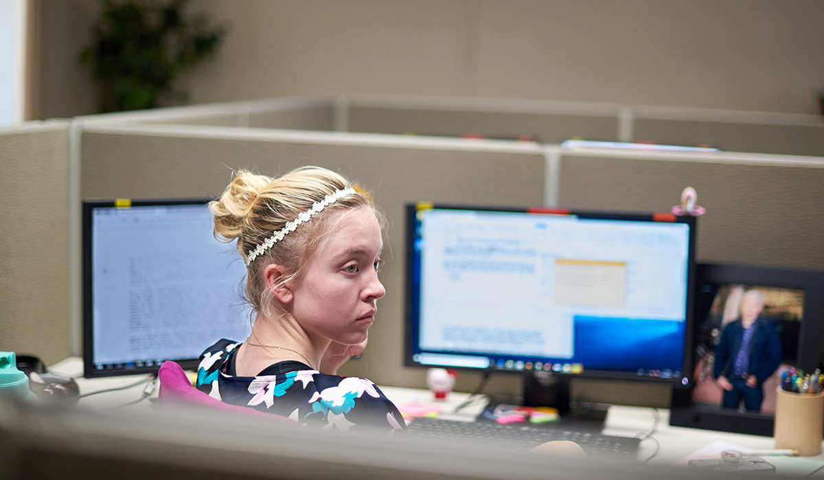 Unlike others in this mode, Satter’s film also flirts prima facie with the realms of fiction, and its images especially make clear that while this work may be based on a true story, it will also provoke a sense of cognitive dissonance in its audience. Its in-demand lead actor, Sydney Sweeney, is the most obvious marker of the film’s hybrid status, her face adorning all promotional materials. Sweeney, her star already set high in the HBO firmament (Euphoria, The White Lotus), has a proven ability to inhabit simultaneously the roles of beleaguered ingénue and pot-stirring bombshell that serve her particularly well here. Late on in the film, Reality Winner explains the lack of surprise she shows at the arrival of the agents on her doorstep as a result of her ‘resting bitch face’, a look that has belied the underhanded motives of some of Sweeney’s previous characters. Against the increasingly pointed questions of the initially friendly FBI, Sweeney executes a range of minuscule muscle twitches, and holds the gaze of her interviewers with eyes that seem perpetually ready to spill over with tears, but never quite get there.