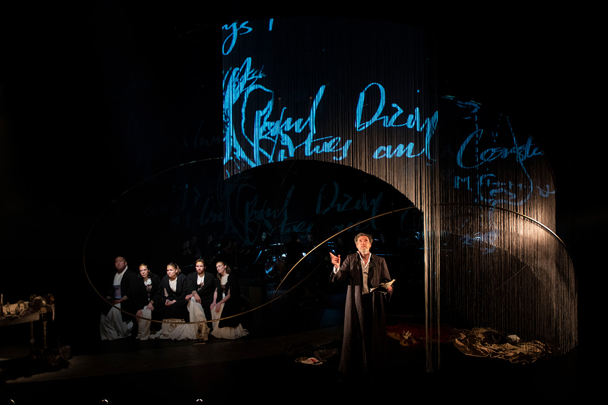 Here, however, director Heather Fairburn presents the work squarely as a historical piece in and of the time of Cardano himself. While her program note states that the opera is ‘unconstrained by a linear narrative’, the twelve scenes (more like vignettes) nevertheless trace out a roughly chronological journey from his birth to death, prefaced by an opening scene in which Cardano consults an astrological chart in order to predict the day he will die.