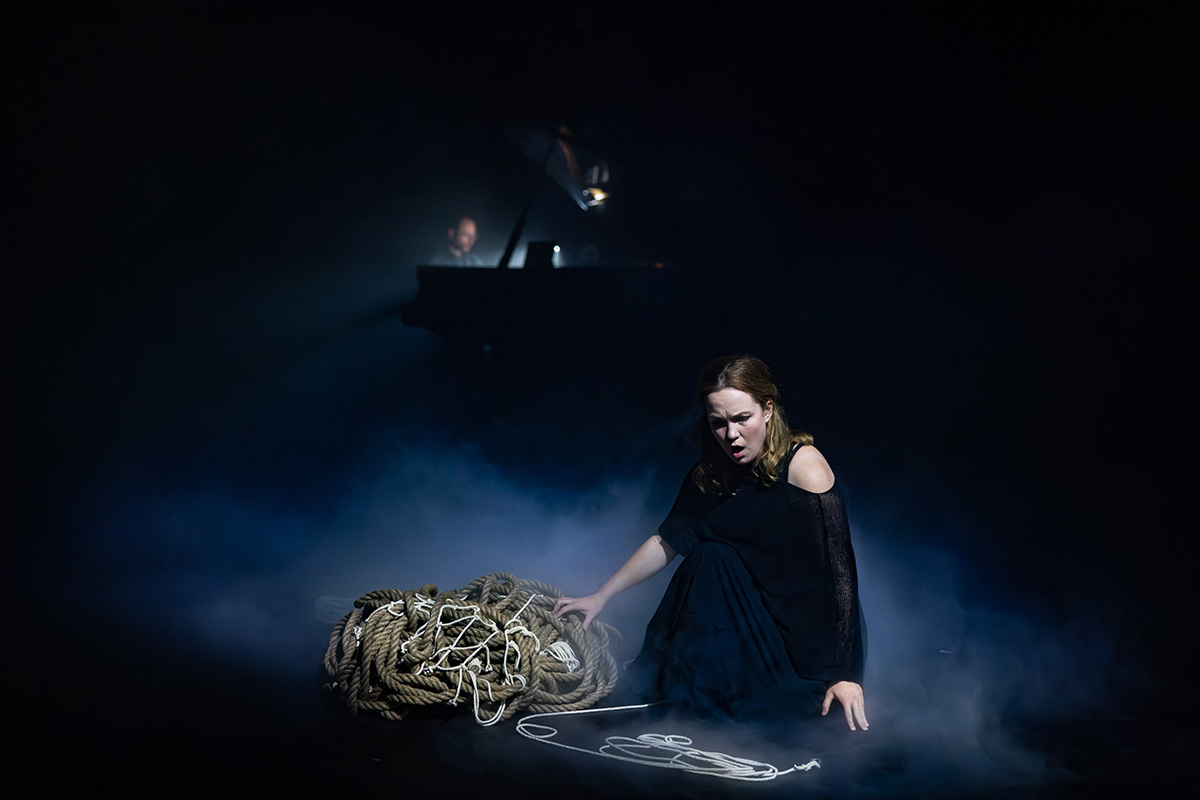 The final work, Quatre Instants, is a song cycle rather than a monodrama, by the outstanding, but sadly recently deceased Finnish composer, Kaija Saariaho (1952–2023), with a French text by Amin Maalouf. Saariaho enjoyed a highly successful career, excelling in many different genres, including the acclaimed opera, L’Amour de loin (Love from Afar), in 2000 – the first opera by a female composer presented at the Metropolitan Opera (2016) since Ethyl Smyth’s Der Wald (The Forest) in 1903. Quatre Instants has four movements, reflecting various dimensions of love underpinning a stormy relationship; the dominant elements being longing, desire, pain, and consummation. It has a restless, glittering piano accompaniment, which again showcased Symonds’s pianistic facility in these widely contrasting contemporary works. Mezzo Emily Edmonds brings a supple, creamy tone with crisp articulation of the text to this striking work. She convincingly conveyed the shifting emotional contours of this twenty-minute vocally demanding work, revealing a gleaming top register and tonal warmth throughout. Clemence Williams directs this work as well, highlighting the dominant aspect of loss, with the simply dressed protagonist, as she gives voice to her emotions, manipulating a large plank of wood which begins to gradually revolve in the mist-shrouded centre of the stage – perhaps a symbolic clock face indicating the passing of time and loss, and bringing a sense of completion to this well-designed program.