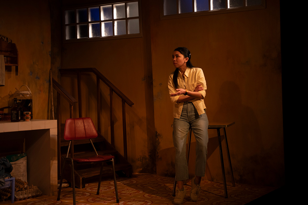 The staging makes excellent use of the tiny theatre. Jacob Battista’s apartment set, with its yellowed flats, begrimed fridge and benchtop, and general air of squalor, is a masterpiece in spatial economy. A doorway leading to a courtyard filled with potted plants, and a staircase trailing off into other, unseen parts of the apartment, ingeniously extend the play’s otherwise oppressively small world. Jason Ng Junjie’s lighting design similarly gestures to larger, out-of-sight places, its warm, sunlight-evoking side lighting particularly expansive. Daniel Nixon’s soundscape subtly but effectively conjures the bustle of Hanoi with its car horns, motorbike growls, and bursts of K-pop and traditional Vietnamese music.