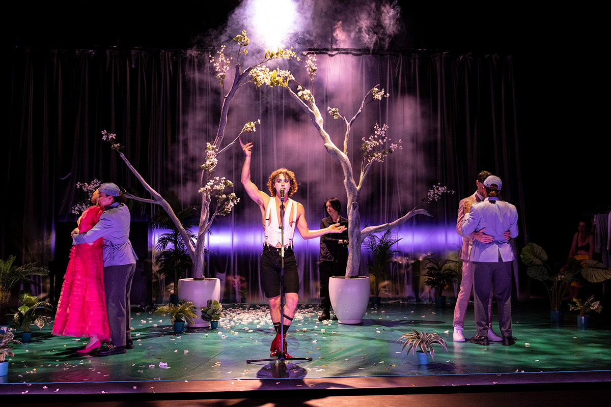 The play’s action is all but stage-managed by Olivia’s jester, Feste, played salaciously and sardonically by Tomáš Kantor, who is given almost as much camp licence to run the show as Frank-N-Furter in The Rocky Horror Picture Show, though he’s more nuanced than that. Kantor’s flair seems to borrow from Marc Bolan’s rock and roll playfulness in T-Rex, if not a touch of Red Symonds from Skyhooks and the wryness of Tim Minchin when singing at the piano, strutting about in a pair of cherry-coloured heels that would make Dorothy envious, and all this rounded off with an Elizabethan ruff to present an updated Feste with just enough room to contain Kantor’s flamboyancy.