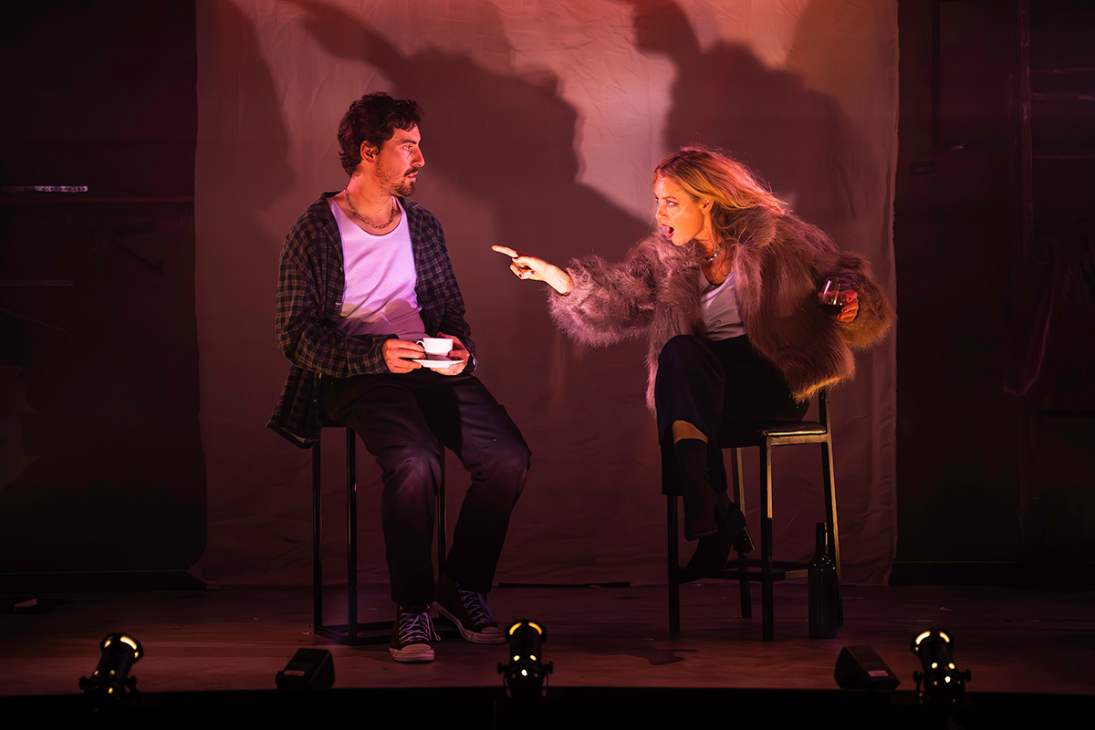 The coarseness in the tone of the production – its lack of variation and subtlety – is reflected in the play’s design (Tom Healey, Chiara Wenban, and Natalia Velasco Moreno). The drably set stage – a space that looks like the back-end of a derelict alley – offers nothing by way of context, swallowing the action rather than foregrounding it. The lighting only exacerbates the problem, the actors often so overwhelmed by shadows that they become little more than belligerent ciphers. Such gloom might reflect the downward trajectory of their lives when they are together, but swamping them in so much darkness only further distances audiences from the characters’ more muted emotions and, crucially, from what their lives might signify.