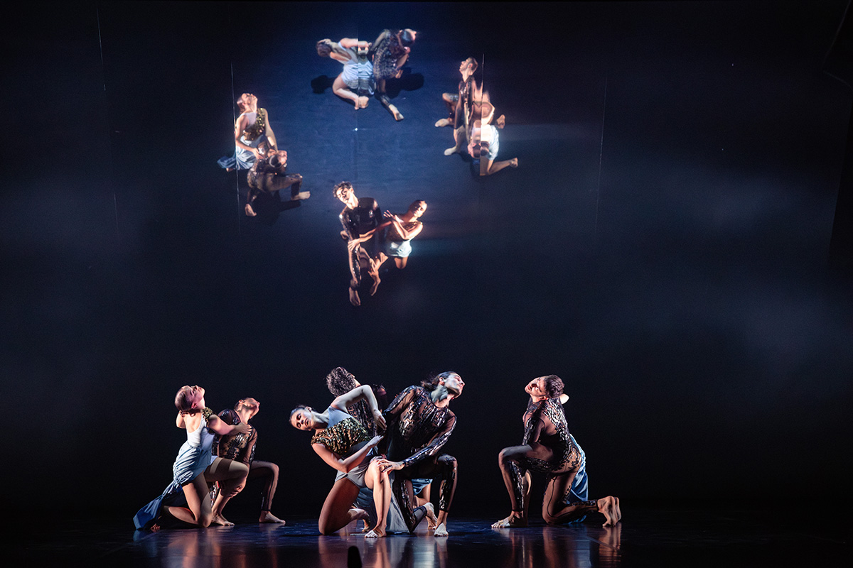 The curtain opened on a sculptural mass, a dark silhouette like a triumphal monument. Kassidy Waters was held aloft by five male dancers as a celestial entity in what I recognised as the opening gambit of Sani Townson’s Kulka (Bloodline), which premièred as part of Bangarra’s Dance Clan in 2023. The work had been significantly embellished for the Horizon season, with the inclusion of a mirrored ceiling designed by Elizabeth Gadsby, suspended at a gradient, capturing and packaging the movement on stage. The previously unadorned setting imbued the work with an expansiveness, despite the compact size of the Drama Theatre. However, the mirror enhanced the temporal and spiritual dimension, as it also captured floor projections of totems, geometric patterns, and dancer Phil Walford as ancestor spirit. The reflection enabled everyone in the house to appreciate the floor patterns unfolding in full kaleidoscopic brilliance.