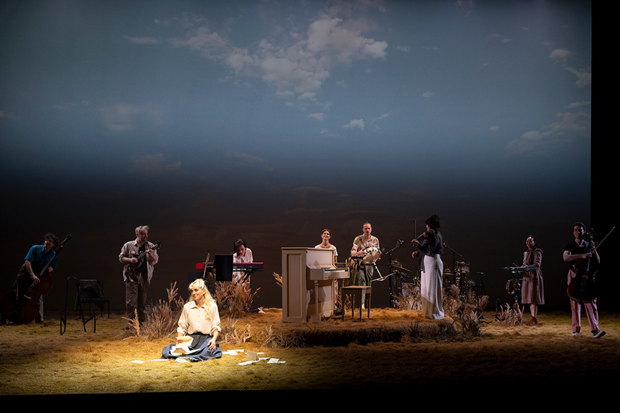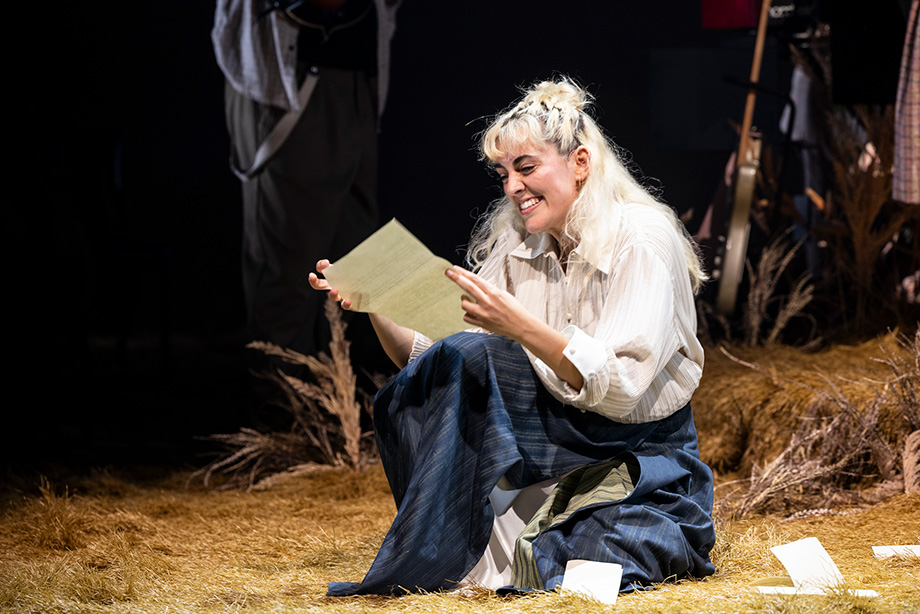 The other star of the show is Anne-Louise Sarks, whose direction of the production – the nadirs and crescendos of Sybylla’s story, her delights and torments, and the whirl and confusion of the world around her – is flawless. Crucially, Sarks nurtures a unity of vision that underpins Gare’s performance and threads through the acting ensemble – nine performers and instrumentalists playing multiple roles and multiple instruments – and supporting creatives (including musical director Victoria Falconer, vocal arranger James Simpson, lighting designer Matt Scott, and choreographer Amy Campbell). Sarks is not afraid to embrace the anachronisms inherent in the musical’s book and song, and the irreverent, raucous tone with which she imbues the production encourages the audience to do the same.