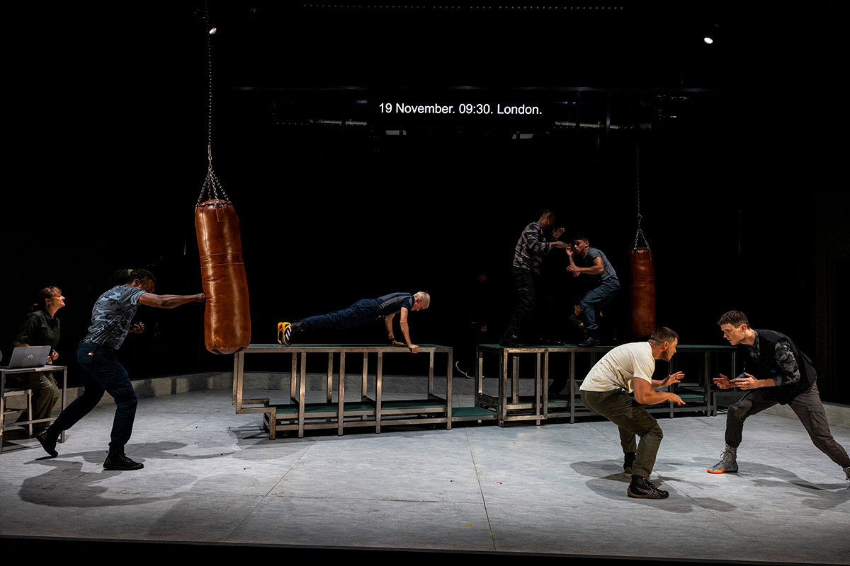 Anna Tregloan’s minimalist set is largely bare except for a long metallic trolley-like structure that bisects the stage, along with a couple of leather punching bags hanging from the ceiling. It evokes a gym or a butcher shop. The trolley proves more versatile in later scenes, though it is not as inventively utilised as it could have been. The costuming is a sea of green, browns, and khaki casual wear; it calls to mind both the Ukrainian war and Silicon Valley tech-bro in their low-key gym attire.