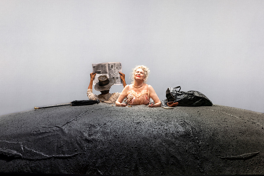Rabe is ably supported by Markus Hamilton, who plays Winnie’s quiet husband Willie. To be fair, it is hard for him to get a word in. Winnie seeks Willie out for affection, but when granted his proximity, she resorts to sarcasm: ‘Well this is an unexpected pleasure!’ Even in their wasteland, Winnie and Willie rehearse the age-old tensions of a marriage. In the most perilous of situations, they remain their ordinary selves. In some productions, no doubt, these moments are played for nihilism. Here, however, Rabe and Hamilton give us the mundanity of daily life as a site of consolation and resilience. Pyrrhic victories feel good in the moment, even if the situation is sinking overall.