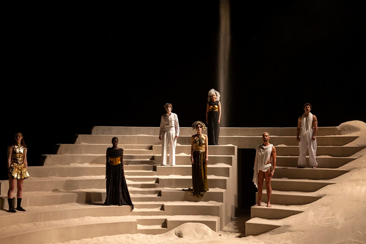 Her outbursts are consonant with the play’s macro-historical perspective. Troy is invoked not as a city of towers but as a heap of dirt, roamed over by untold peoples. The play opens with the cast gathered on a ruined amphitheatre, half swallowed by sand, a structure that is both arena and tomb. They chant the names of vanished tribes and empires, a litany of occupation stretching across millennia. From overhead, a thin stream of sand pours into the theatre, collecting below like the hourglass of forever.