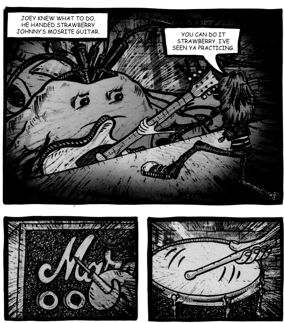 Narratively, she has also judged an appropriate weight of story and depth of characterisation to keep us involved in the tale of a washed-up, insurance-selling snake called Ray and a glowing jellyfish ingénue called Strawberry as they set off on a roadtrip which ends at the legendary New York music venue CBGBs, attending concerts given by the even more legendary band The Ramones. Even though a depressed snake and a misunderstood jellyfish are our main characters, their story does overlap with historical events: the famous 1977 New York blackout is a mystery for which this graphic novel charmingly and satisfyingly provides an explanation.