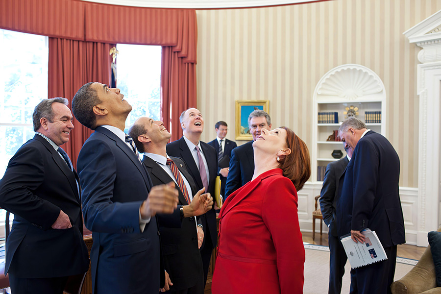 President Barack Obama and Prime Minister Julia Gillard looking at the presidential seal, 2011 (American Photo Archive/Alamy