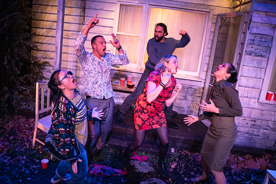 The play, which premièred off-Broadway at the Alice Griffin Jewel Box Theatre in 2023, sees five friends gather in the hours before a limousine is due to arrive – ironically, of course – to whisk them away to their twenty-year reunion. The house, in the suburbs outside Washington DC, belongs to Ursula (AYA), who is blind in one eye from the effects of diabetes. The first to arrive is Emilio (Khisraw Jones-Shukoor), a successful multidisciplinary artist now based in Berlin, followed by Caitlin (Julia Grace), Kristina (Tess Masters), and Francisco (Kevin Hofbauer). A sixth friend, Simon (Douglas Lyons), joins the pre-event drinks periodically by video call, having given his apologies for the event proper. Collectively, the group is known as MERGE, a not-quite acronym for ‘multiethnic reject group’. These are not the cool kids grown up but, rather, the misfits whose shared experience of social ostracism bonded them for life.