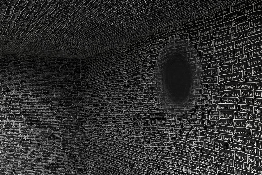 The common ancestors from 3,000 years ago that connect all humans are delineated, as are the words, names, and slurs applied to First Nations peoples in the archive after 1788. This extensive research is expressed as a holographic map of relations, with ‘holographic’ used in the sense of a document that is completed in the author’s hand. The use of chalk on blackboard also evokes Moore’s schooling in a system in which Indigenous understandings of nature and culture were excluded and alien. Three bare patches on the high black walls mark interruptions to lineage due to disease, massacre, and deliberate destruction of Country, as well as records and evidence of First Nations occupation.